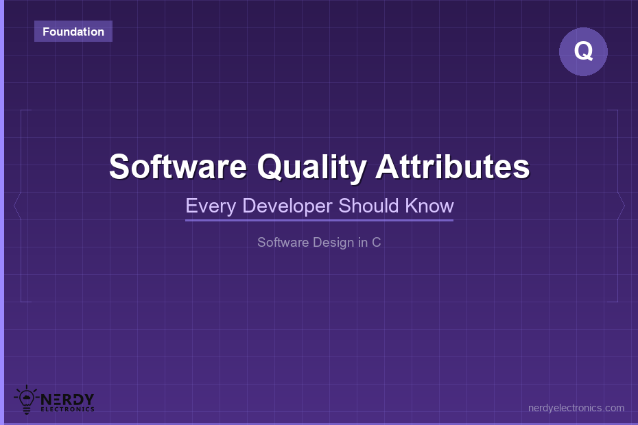 Learn the key software quality attributes: maintainability, reliability, testability, readability, reusability, modularity, and more. Each term explained with simple C examples.