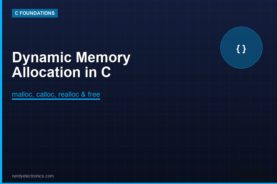 Learn how to use malloc, calloc, realloc, and free in C for dynamic memory allocation. Understand stack vs heap, common pitfalls like memory leaks and dangling pointers, and best practices for embedded systems.